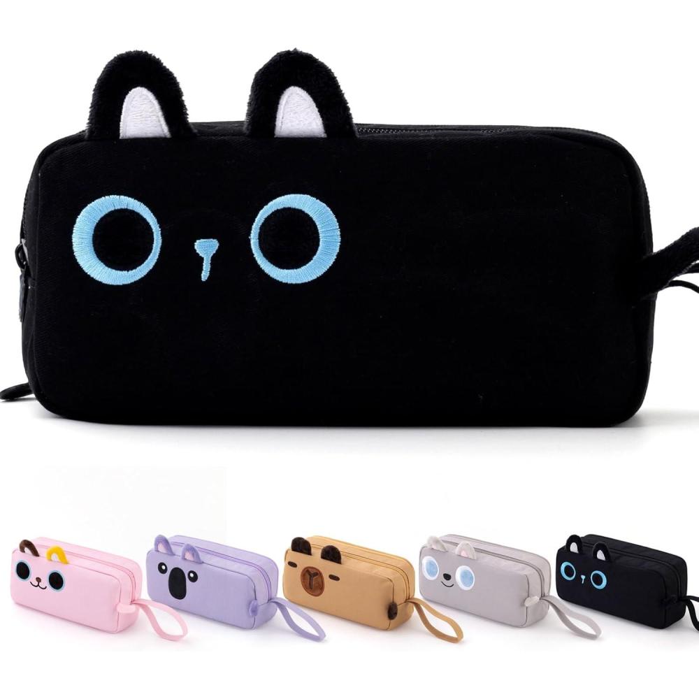 Adorable 3D Embroidered Animal Designs with Fluffy Ears & Tails: This pencil case features cute 3D embroidered animals including a black cat, pink kitty, brown capybara, purple koala, and gray dog, complete with fluffy ears and tails. These playful details make it a fun and unique addition to your school or office supplies