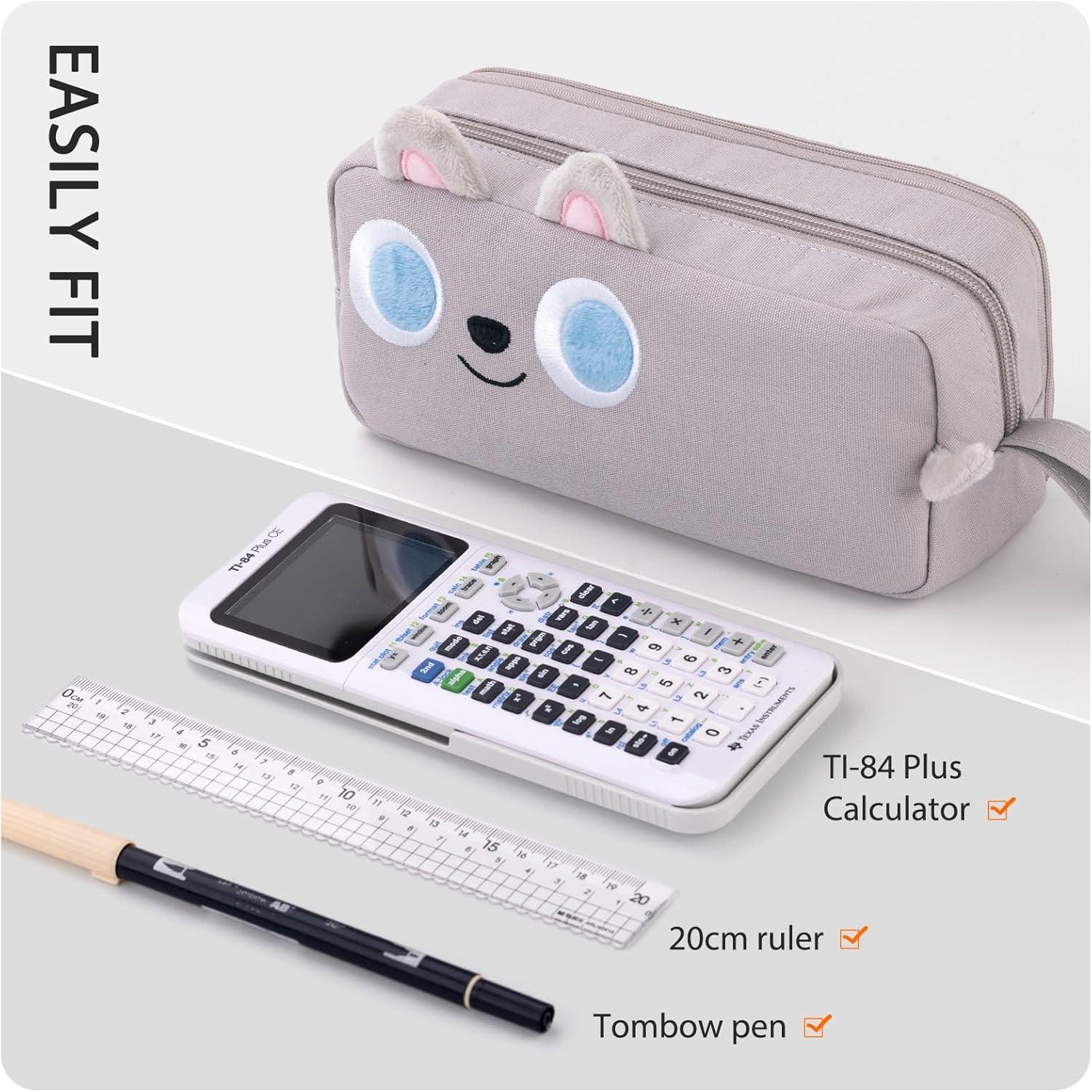CICIMELON Cartoon Pencil Case, Large Capacity Pen Pouch with Embroidered Animal Design, School Supplies Bag for Kids, Teens, Students (Gray Dog)(Pink Kitty)
