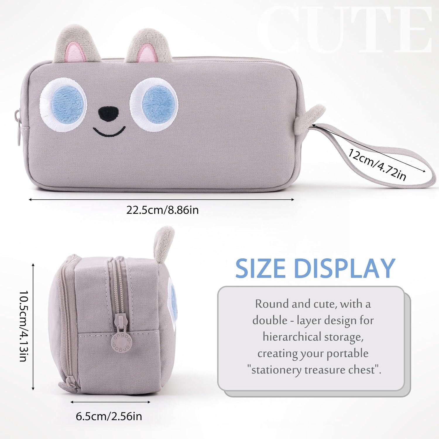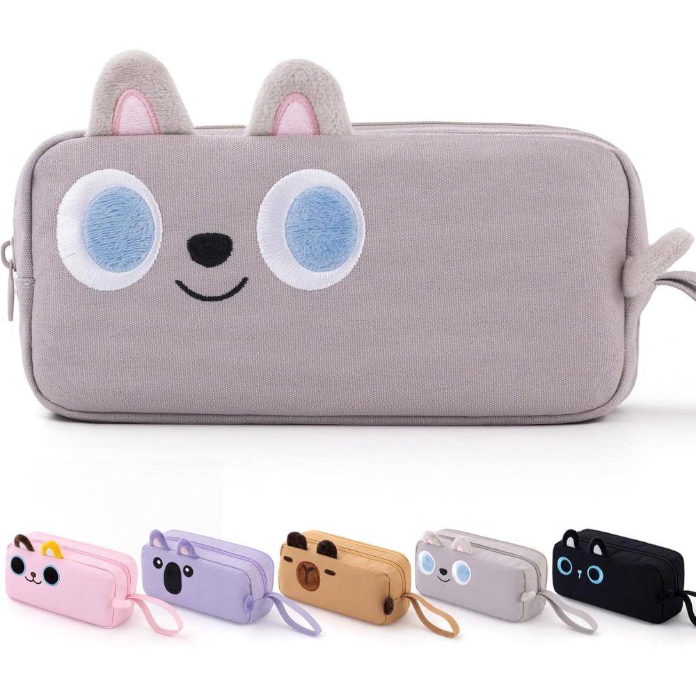 CICIMELON Cartoon Pencil Case, Large Capacity Pen Pouch with Embroidered Animal Design, School Supplies Bag for Kids, Teens, Students (Gray Dog)(Gray Dog)